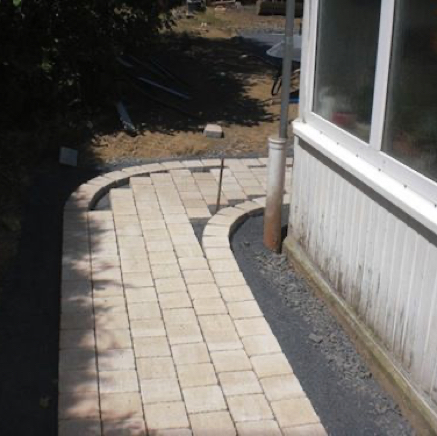 Erstellung von PKW-Stellplätzen, Gartenweg und Beet-Einfassung aus Betonpflaster „Castilla"in der Farbe Sandbeige. Der Weg mündet in einen Freisitz im hinteren Teil des Gartens. Weitere Photo-Beispiele für Gartengestaltung - Gartenterrassen - Gartensanierung - Pflasterung - Garten-Umgestaltung - Holzterrasse anlegen