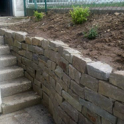 Hangbefestigung durch Grauwacke Trockenmauer, Erstellung einer Holzterrasse und Verlegung von Rollrasen. Weitere Photo-Beispiele für Gartengestaltung - Gartenterrassen - Gartensanierung - Pflasterung - Garten-Umgestaltung - Holzterrasse anlegen